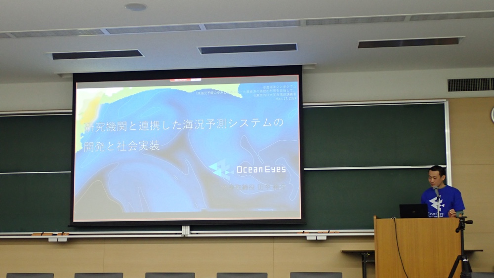 シンポジウムのテーマは「漁海況予報の歩みと技術革新−水産資源の持続的利用を目指して」ということで、田中代表からは弊社の基幹技術である数値モデルを使った海況予測について、研究プロジェクトから社会実装までの流れを紹介しました。飯山教授からは水産海洋の分野で最新AIを使ってどんなことができるか、さまざまな可能性を紹介しました。